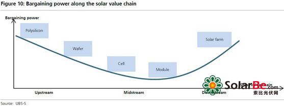 在光伏产业链上,上中下游议价能力的强弱呈现出“微笑曲线”,处于曲线两端的是议价能力比较强的上游(特别是多晶硅)和下游(光伏电站开发商),中游(电池和组件)是价格的接受者,毛利率相对更低。瑞银估计,多晶硅、晶圆、电池、组件的长期毛利率分别稳定在25%、20%、15%、13%左右。