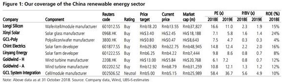 具体到个股标的,瑞银认为平价上网刺激可再生能源需求增长,上游的光伏/风电制造商最先受益,首选隆基股份、信义光能、金风科技、保利协鑫能源。