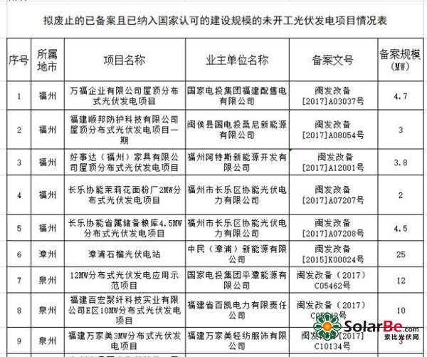 按照《国家能源局综合司关于梳理“十二五”以来风电、光伏发电项目信息的通知》(国能综函新能〔2018〕367号)要求,福建省发改委根据各地报送的项目情况,认真核实“十二五”以来风电、光伏发电项目情况,梳理出拟废止的风电项目5个、光伏项目544个,现予以公示,详见附件。