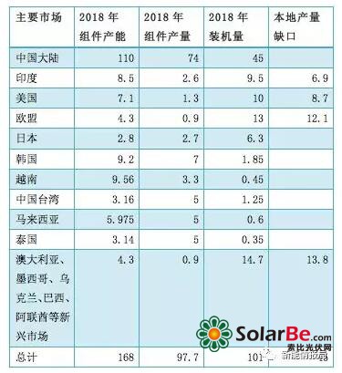 他表示,以美国、印度、欧盟为代表的全球光伏主要市场均对我国发起贸易摩擦事件,而这些主要市场的本地光伏产品产量缺口达到45GW,主要依靠进口,大部分由中国出口及中国企业海外产能供给。