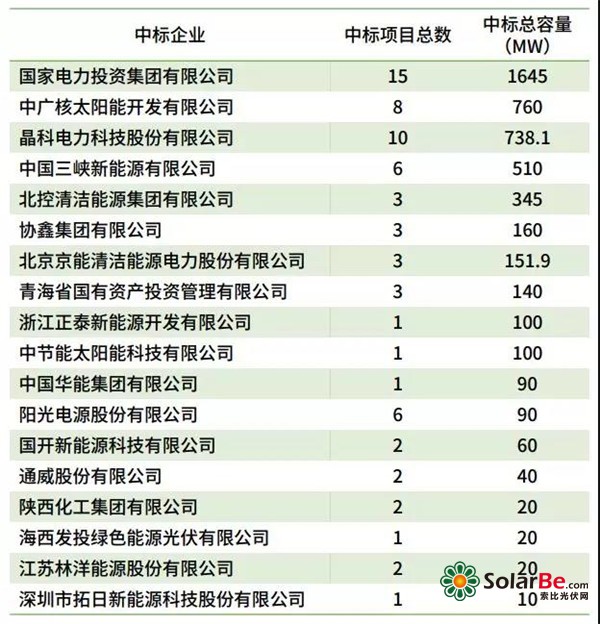 国电投、中广核、北控清洁能源、中节能等国企单独得标量达52%,整体得标量超过80%。完全由晶科、通威、正泰新能源等民企自行得标的项目仅有400MW,不及10%。