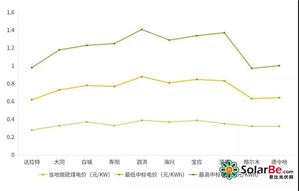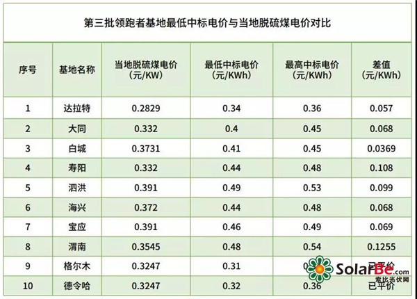 领跑者的主要目标,一是促进先进技术的推广,二是通过市场手段获得低电价,推进光伏上网电价的降低。根据第三批领跑者的中标结果,最低中标电价与当地的脱硫煤标杆电价只相差3.6~12.5分/kWh。