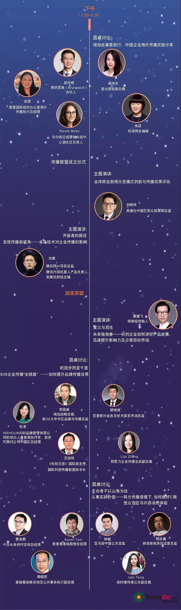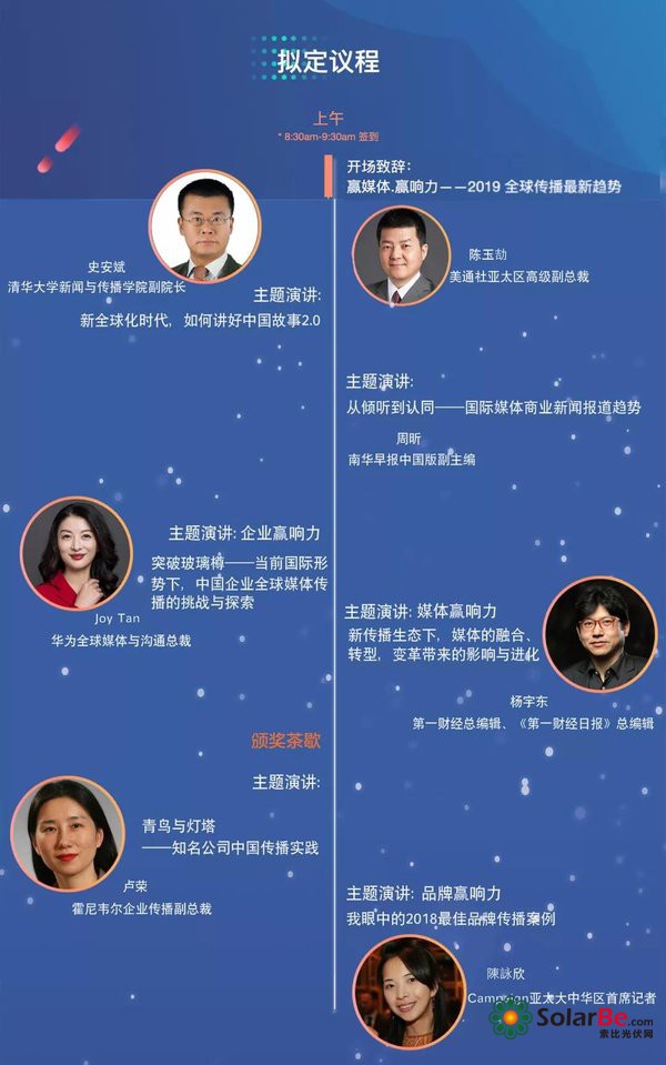 论坛将分为上下午两场。上午场为主题演讲,将探讨全球传播和商业新闻报道的最新趋势、企业在传播中面临的挑战及实践、媒体转型与变革所带来的影响等;下午场将延伸至新闻分发模式创新和技术升级对企业传播的影响、中国企业的海外传播实践、2B及2C企业传播攻略等。论坛的演讲和圆桌嘉宾将分别有来自环球网、华尔街日报、腾讯、今日头条、新浪、百度等的媒体人士,来自华为、亚马逊、保时捷等的企业人士以及来自清华大学、爱德曼、博然思维等的研究和公关咨询人士。