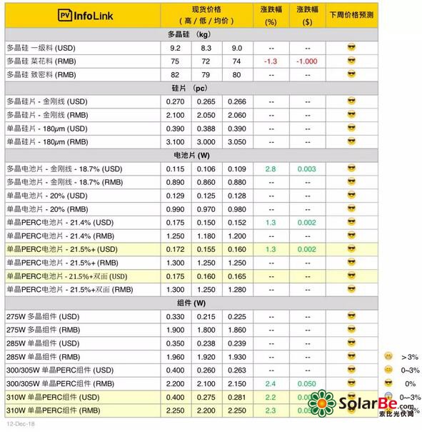 随着年底的抢装潮进入尾声,多晶电池片的拉货进入最后的高峰。且由于先前许多电池片厂已陆续下调或放弃多晶电池片的制造,使得11-12月多晶电池片算是供需平衡,在上周上涨后,本周国内转换效率18.7%+的电池片价格维持在每瓦0.88元人民币上下。