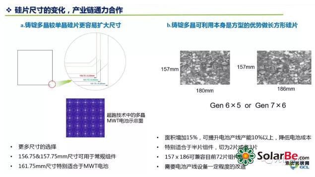 3、组件功率大大提高。小编估算,采用166硅片的60型类单晶组件,将轻松突破360瓦的功率,而72型类单晶组件功率将突破436瓦。而组件功率的提高,将有助于降低光伏电站安装的人工成本等。