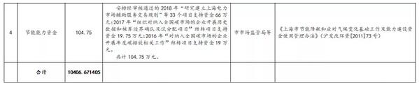 4、根据《上海市节能降耗和应对气候变化基础工作及能力建设资金使用管理办法》(沪发改环资[2011]73号)等相关规定, 安排经审核通过的2018年“研究建立上海电力市场辅助服务交易规则”和32个“标准修订”项目支持资金66万元;2017年“组织对纳入全国碳市场的企业开展历史数据和核算边界确认及试分配项目”结转项目支持资金19.75万元;2016年“对纳入全国碳市场的企业开展年度碳排放相关工作”结转项目支持资金19万元。共计104.75万元。