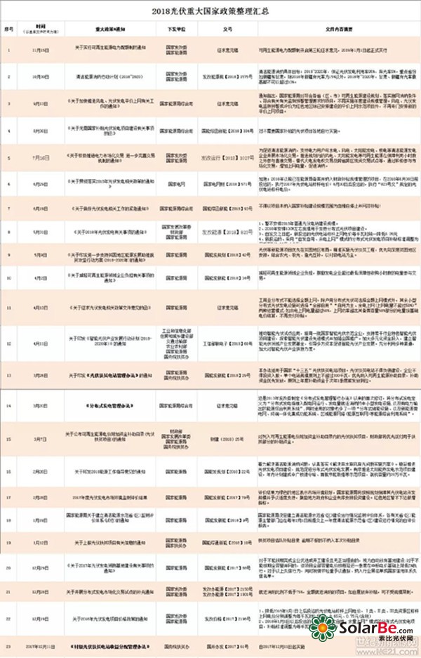 以上23条政策基本围绕光伏扶贫、分布式管理、电价调整、清洁能源消纳、可再生能源配额制这五个方向展开,我们也按照这五个方向对全年的政策进行大致梳理: