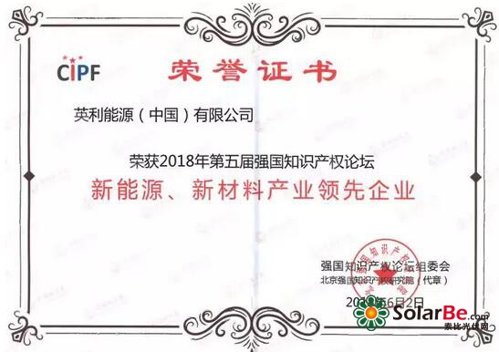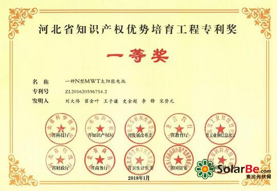 1月底,河北省科技厅、知识产权局等10部门联合发布《关于2017年河北省知识产权优势培育工程专利奖授奖的决定》,英利申报的“一种N型MWT太阳能电池”专利荣获“河北省知识产权优势培育工程专利奖”一等奖,是河北省专利奖最高奖项。