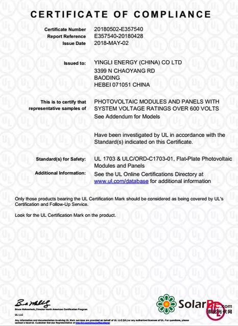4月28日,英利“熊猫”双面发电组件顺利通过美国UL双面认证。据悉,该认证为全球首个,英利成为全球首家通过美国UL双面认证的光伏企业。