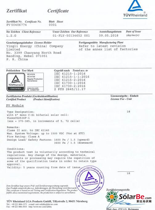 5月14日,英利“熊猫”双面发电组件获得TüV莱茵颁发的双面发电认证证书,至此,英利“熊猫”已获CGC鉴衡、美国UL和TüV莱茵国内外三大知名认证机构的双面发电全球“通行证”,为全球首个。