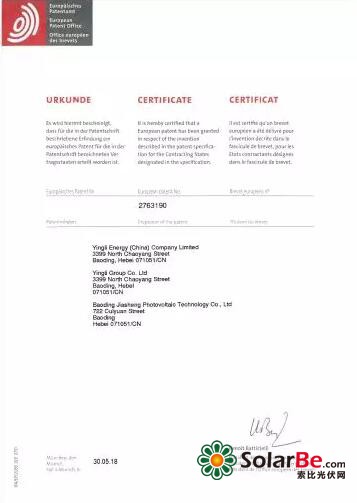 8月,英利发明专利“太阳能电池片及其热处理工艺在欧洲获得授权。这是英利继美国、日本获得专利后,第三个通过国际PCT途径获得授权的国外专利。