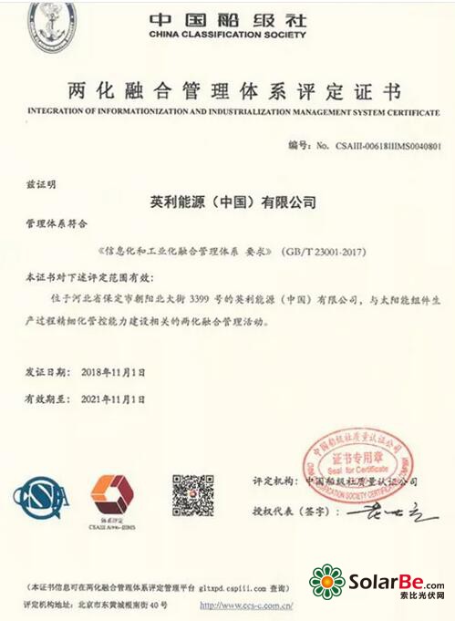 11月,英利收到由国家工信部授权的评定机构—中国船级社质量认证公司颁发的“两化融合管理体系评定证书”,顺利通过了国家工信部的两化融合管理体系贯标评定,标志着英利在推进信息化和工业化融合方面取得了新突破。