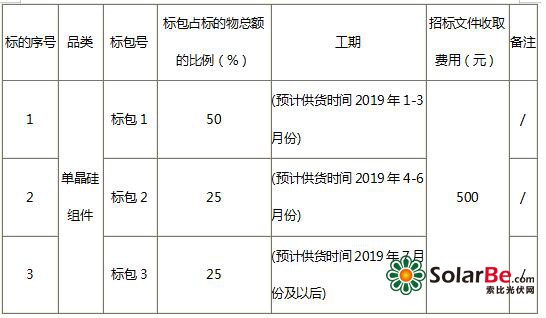 本次招标供货量为40MW,分3个标包,标包1招标供货量20MW,预计供货时间2019年1-3月份,标包2招标供货量10MW,预计供货时间2019年4-6月份,标包3招标供货量10MW,预计供货时间2019年7月份及以后。