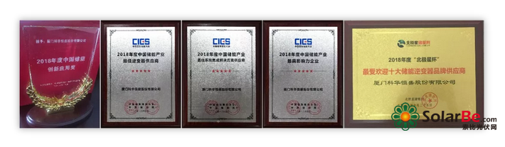 基于优秀的市场表现,突出的系统集成、行业拓展能力,科华恒盛2018年连连摘得业内荣誉——“2018年度中国储能创新应用奖”“2018年度中国储能产业最佳逆变器供应商”“2018年度中国储能产业最佳系统集成解决方案供应商”“2018年度中国储能产业最具影响力企业”“2018年度最受欢迎十大储能逆变器品牌供应商”......