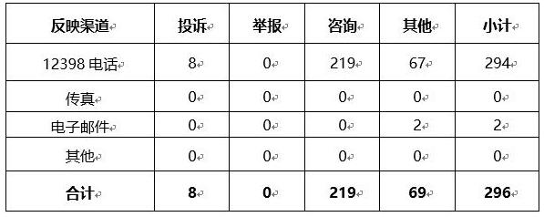 按反映渠道分类,12398电话294件,电子邮件2件。