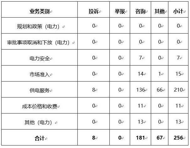 投诉共8件,均集中在电力行业。从业务分类情况看,8件均为供电服务。