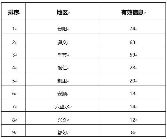 贵州各市、州按照收到的有效信息数量排序,贵阳74件,列第1位;遵义63件,列第2位;毕节59件,列第3位。