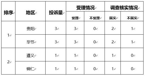 按照收到的投诉举报数量排序,贵阳、毕节各3起,遵义、铜仁各1起。
