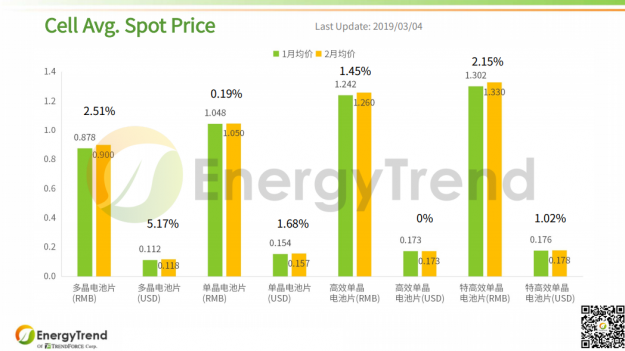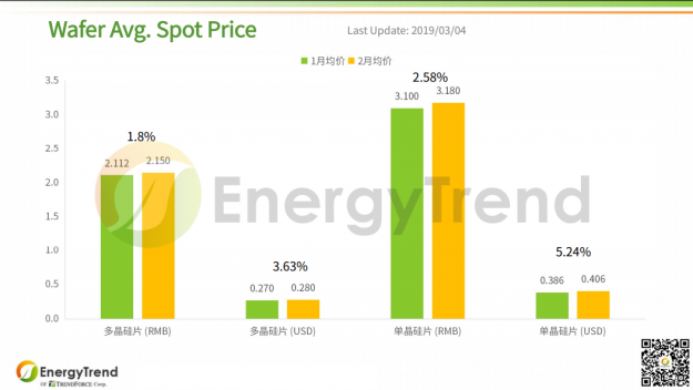 硅片环节,多晶硅片的人民币月均价为从1月的 RMB2.112/Pc 增加至2月的 RMB2.15/Pc,涨幅为 1.8%; 美金月均价为从1月的 US$0.27/Pc 增加到至2月的 US$0.28/Pc,上涨幅度为 3.63%。单晶硅片1月的人民币月均价为 RMB3.1/Pc,2月为 RMB3.18/Pc,较先前增长了 2.58%;其美金月均价从 US$0.386/Pc 上涨至 US$0.406/Pc,涨幅达到 5.24%。