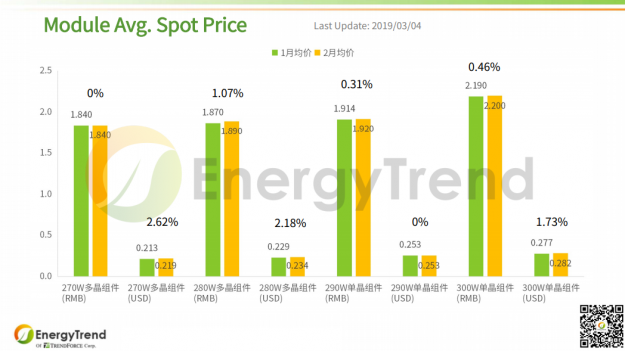 在组件端,常规多晶组件人民币2月月均价为 RMB1.84/W,保持不变;美金月均价从 US$0.213W 增长至 US$0.219/W,增幅为 2.62%。高效多晶组件2月月均价为 RMB1.89/W,比1月份的 RMB1.87/W 增加了 1.07%;美金均价从 US$0.229/W 上浮至 US$0.234/W,涨幅为2.18%。常规单晶组件2月均价为 RMB1.92/W,比1月的 RMB1.914/W 增加了 0.31%;海外方面,常规单晶组件最新美金月均价为 US$0.253/W,和上月持平。高效单晶组件2月人民币均价为 RMB2.2/W,比1月均价为 RMB2.19/W 有所增加;其美金月均价从1月的 US$0.277/W 增加了 1.73% 来到 US$0.282/W。
