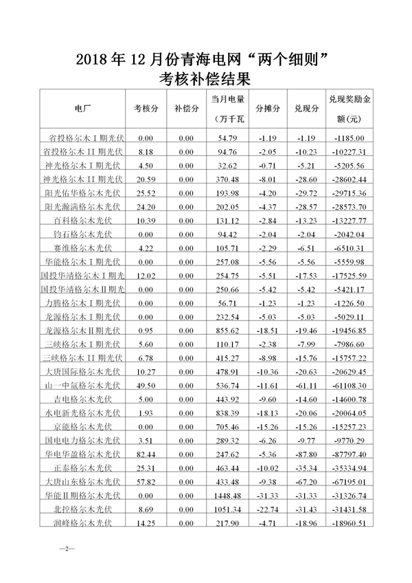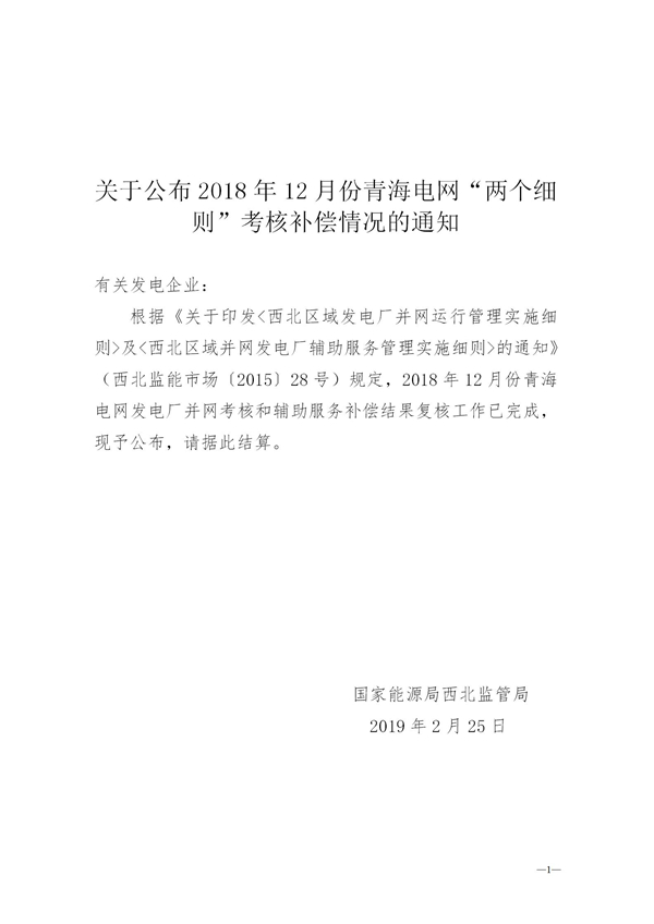 近日,国家能源局西北监管局关于公布2018年12月份青海电网“两个细则”考核补偿情况的通知。有关发电企业:根据《关于印发<西北区域发电厂并网运行管理实施细则>及<西北区域并网发电厂辅助服务管理实施细则>的通知》(西北监能市场〔2015〕28号)规定,2018年12月份青海电网发电厂并网考核和辅助服务补偿结果复核工作已完成,现予公布,请据此结算。国家能源局西北监管局2019年2月25日附件:关于公布2018年12月份青海电网“两个细则”考核补偿情况的通知