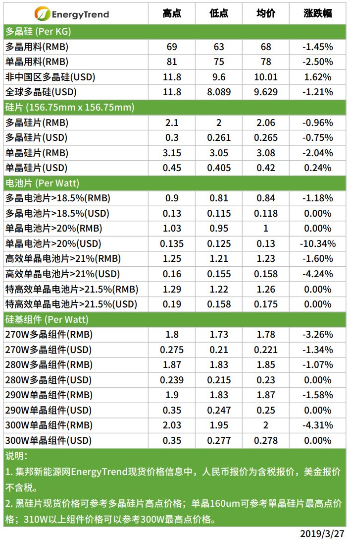 本周电池片市场价格继续下探。由于下个月即将修正增值税,估计目前市场价格未能及时反应实际需求,海外单晶电池因为组件需求仍然维持稳定用量,尤其对于美国市场需求间接带动东南亚及台湾电池的拉货。目前国内一般多晶电池价格下调至0.81~0.9RMB/W;均价下调至0.84RMB/W,一般单晶电池价格维持不变在0.95~1.03RMB/W,高效单晶电池价格修正区间至1.21~1.25RMB/W;均价则是下调至1.23RMB/W,特高效单晶(>21.5%)电池价格下调至1.22~1.29RMB/W;均价维持不变在1.26RMB/W。海外一般多晶电池价格维持不变在0.115~0.13USD/W,一般单晶电池价格修正区间至0.125~0.135USD/W;均价下调至0.13USD/W,高效单晶电池价格修正区间至0.155~0.16USD/W;均价下调至0.158USD/W,特高效单晶电池(>21.5%)价格则是修正区间至0.158~0.19USD/W;均价维持不变在0.175USD/W。双面电池行情价格则是修正区间至1.24~1.3RMB/W。