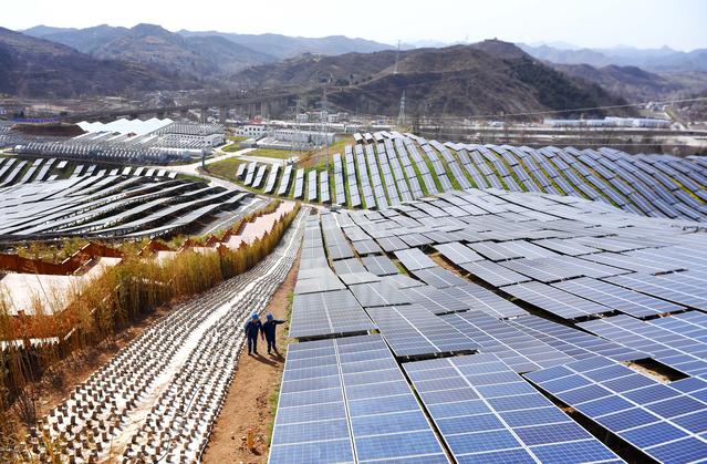电力工人在陕西省商洛市商州区龙山光伏电站巡视(3月29日摄)。该电站于2018年10月建成投运,光伏发电可带动全区1.18万户贫困户户均年增收3000元左右,光伏下农业产业可带动1870户贫困户户均年增收近3000元。