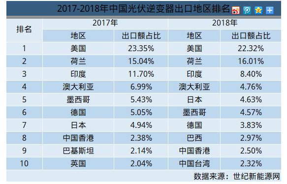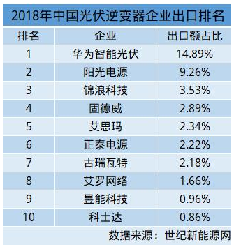 对比2017年出口额数据,前三甲中,华为成功卫冕,阳光电源始终保持坚挺,仍位列第二,刚在A股上市的锦浪科技位列第三。由世界500强企业加上A股仅有的两家逆变器为主营业务上市企业构成了前三的梯队,强者恒强的定律再次获得了验证。