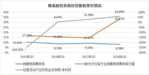 同时,从上图还能够看出,近几年中,隆基股份强化了成本管控,提高了运营效率,销售期间费用率(三费比)维持了稳定的下降趋势,并进一步来开了与行业平均水平的差距。2018年前三季度,从行业平均三费比的大幅增加,可以看出光伏产业此轮洗牌给国内光伏设备企业带来的销售成本、管理成本等高额增长,以及巨大竞争压力。但与之相反的是,依托品牌、市场等优势,隆基股份在出货量大增的前提下,三费比甚至出现了继续缩减的趋势。