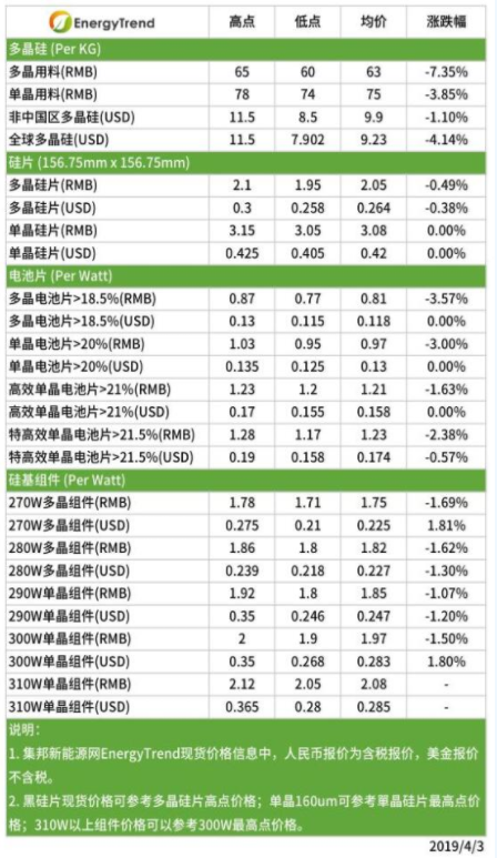 本周组件市场随产品与各地区需求影响而对应修正价格,国内市场受到税制调整则是全面小幅调降以反应实际市场状况,海外市场产品则是跌多涨少,因需求不同而此起彼落。目前国内一般多晶组件价格下修至1.71~1.78RMB/W,均价下调至1.75RMB/W,高效多晶组件价格下修至1.8~1.86RMB/W,均价下调至1.82RMB/W,一般单晶组件价格下修至1.8~1.92RMB/W,均价下调至1.85RMB/W,高效单晶组件价格下修至1.9~2RMB/W,均价下调至1.97RMB/W,特高效单晶(>310W)组件价格修正区间至2.05~2.12RMB/W,均价下调至2.08RMB/W。
