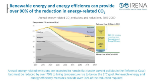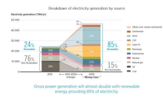 IRENA提供的分析表明,预计到2050年全球能源需求将翻一番,并且在同一时间段内可再生能源可满足全球86%的电力需求。从目前的水平来看,额外的能量负荷将主要由风能和太阳能装置承载。