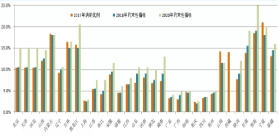 图2:2017年可再生能源电力消纳以及第三轮征求意见的2018、2020年非水可再生能源电力比例指标
