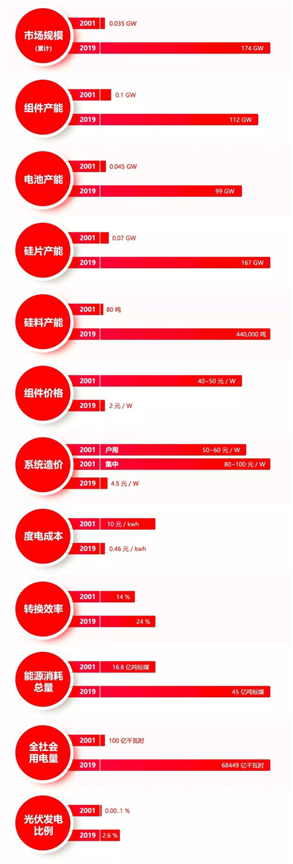 如今,中国光伏无论在市场规模、成本水平、技术能力、制造能力、供应链领先度等各个方面,均已成为全球第一。2019年,是隆基股份成立的第19个年头,隆基是幸运的,成立以来的19年恰是中国光伏的黄金19年,现在让我们来对比一下中国光伏的曾经与今天吧!