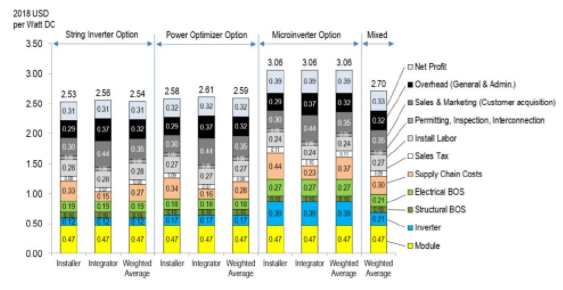 事实上,NREL最新的成本分析发现,以每瓦0.35美元的价格(图中灰色部分),“客户获取”成本是仅低于模块成本的第二高成本。这意味着“客户获取”大约占系统总成本的13%。