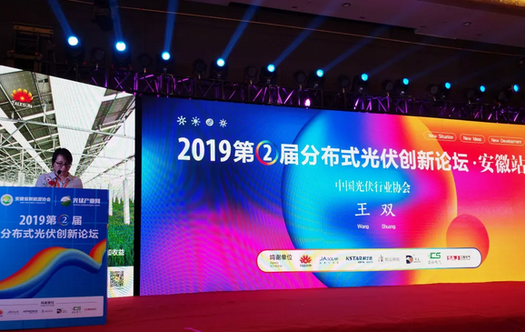 在致辞中,王双简要介绍了我国分布式光伏的发展历程、发展现状以及发展形势。自2000年我建成了国内第一个屋顶并网系统至今,我国分布式光伏发展经历了萌芽期,规模发展期和加速期。2018年,我国分布式光伏新增装机量20.96GW,同比增长8%,在新增装机里占比超过47%。2019年第一季度,全国新增装机5.2GW,除扶贫外,有相当规模均为工商业分布式无补贴项目。纵观我国分布式光伏政策和市场的发展演变历程,除了政策促进作用之外,最主要的动力来源于技术创新升级带动下的光伏系统成本的下降。