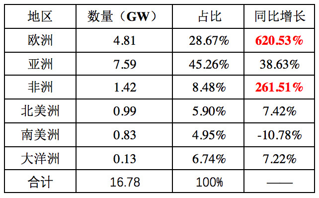 2019年1季度,国内组件出口量为 16.78 GW ,同比增长77.63%。其中,最强劲的增量市场来自于欧洲,同比增长率达到620%,成为我国最大的出口市场;非洲市场也出现了261%的同比增长。如下表所示。