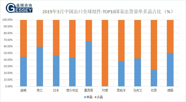 就组件而言,不同市场的需求偏好差异很大。根据盖锡咨询的报告,出口前十市场的单多晶比例如下图所示。