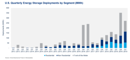 在兆瓦级部署方面,备份的能源存储部署占所有第一季度部署的46%,比上一季度增长36%,同比增长138%。然而,在2018年底完成了一系列的前端项目后,按照兆瓦时的部署情况,2018年第四季度市场下降了23%。