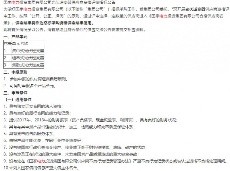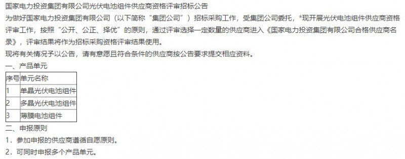 中国电力招标网消息,日前,国家电力投资集团有限公司发布了光伏电池组件供应商资格评审招标公告以及光伏逆变器供应商资格评审招标公告。评审出来的供应商将进入《国家电力投资集团公司合格供应商名录》,作为招标采购资格评审结果使用。