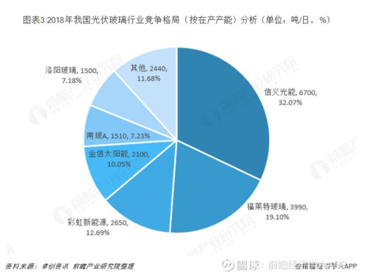 现阶段,我国光伏玻璃行业已形成信义光能、福莱特双寡头格局。根据卓创资讯统计数据,2018年国内光伏玻璃在产产能排前三企业的依次是信义光能、福莱特玻璃和彩虹新能源,这三家企业的在产产能分别为6700/3990/2650吨/日,分别占国内总在产产能的32.07%、19.10%、12.69%,其中前两者的合计市占率将近50%。