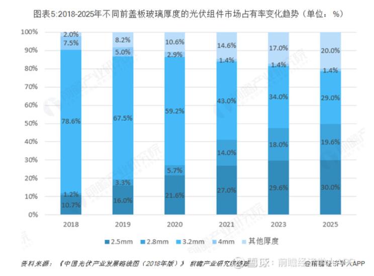 随着组件轻量化和技术的不断更新,光伏组件盖板玻璃会逐渐减薄,目前亚玛顿已成功研发出使用1.6mm光伏玻璃基板的超薄(4mm厚)双玻BIPV组件,并正在更进一步研发3毫米厚超薄双玻组件。目前光伏组件前盖板玻璃厚度的规格主要有2.5、2.8、3.2、4.0mm,2018年市面上最广为流通的是厚度为3.2mm的前盖板玻璃,其市场占有率高达78.6%。未来3.2mm的前盖板玻璃的市占率将会被不断压缩,预计到2025年,2.5mm前盖板玻璃将成为市占率第一;厚度2.0mm以下的前盖板玻璃的市占率也将快速提升。