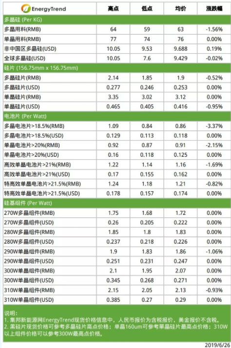 本周电池片市场价格随着专业电池大厂的定锚变化,国内电池片产品价格全面下调。海外市场尚未感受到下调价格的威胁,估计下周有机会跟进市场。虽然单晶电池片今年预测占有率提高,主要原因乃是下游系统商的LCOE计算模式有利于高功率产品,特别是双面产品,倘若再考量到今年新兴国家的装置量预期成长,竞标制以及低成本的平价上网与中国今年的口号相近不远,所以近期多晶其实热度不输单晶。