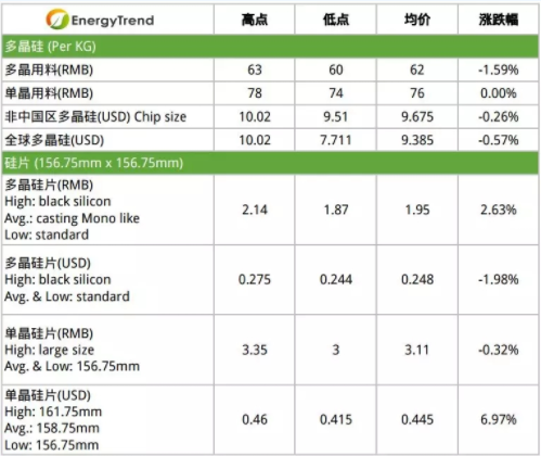 本周硅片市场交易变化不大,主要受到下游需求放缓,交易态度受到影响导致。单晶硅片受到跌价影响甚深,也是因为前后需求落差过大而形成价格崩跌。多晶硅片市场维持前几周的稳中带跌的趋势行进。目前海外市场单晶156.75mm产品维持不变在0.415USD/Pc,158.75mm产品维持不变在0.455USD/Pc,161.75mm产品维持不变在0.460USD/Pc。多晶修正区间至0.244~0.248USD/Pc,黑硅产品下调至0.275USD/Pc。国内单晶修正区间至3.00~3.11RMB/Pc,大尺寸产品维持不变在3.35RMB/Pc。多晶维持不变在1.87RMB/Pc,铸锭单晶产品维持不变在1.95RMB/Pc,黑硅产品维持不变在2.14RMB/Pc。
