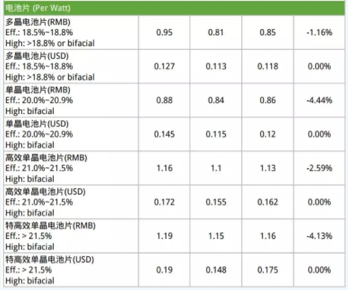 国内一般多晶电池片修正区间至0.81~0.86RMB/W,均价下修至0.85RMB/W,高效多晶电池片下调至0.95RMB/W,一般单晶电池片修正区间至0.84~0.88RMB/W,均价下调至0.86RMB/W,高效单晶电池片修正区间至1.10~1.16RMB/W,均价下调至1.13RMB/W,特高效单晶(>21.5%)电池片修正区间至1.15~1.19RMB/W,均价下调至1.18RMB/W。双面高效单晶电池片维持不变在1.175RMB/W,双面特高效单晶(>21.5%)电池片下调至1.19RMB/W。