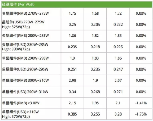 国内270W~275W产品维持不变在1.68~1.75RMB/W,280W~285W产品维持不变在1.82~1.86RMB/W,290W~295W产品维持不变在1.83~1.90RMB/W,300W~305W产品修正区间至1.90~2.08RMB/W,均价维持不变在2.07RMB/W,>310W产品修正区间至1.95~2.15RMB/W,均价下调至2.10RMB/W。