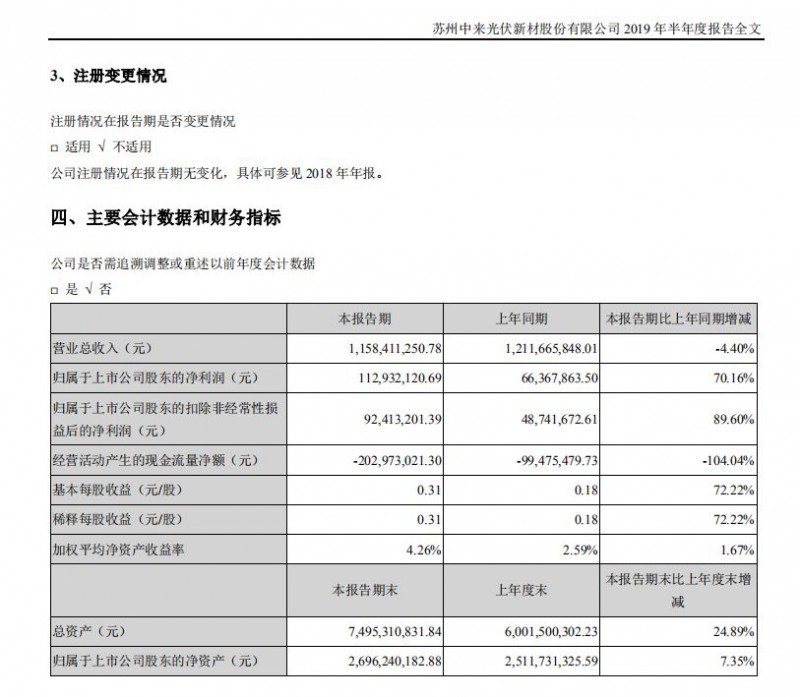 7月18日晚,中来股份发布2019年半年度报告显示,1月份至6月份,公司实现营业收入11.58亿元,同比下降4.40%,实现归属于上市公司股东的净利润1.13亿元,同比增长70.16%。基本每股收益0.31元,同比增长72.22%。