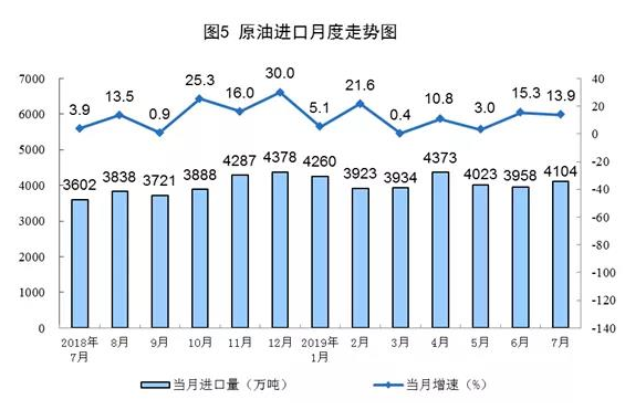 7月份,进口原油4104万吨,同比增长13.9%,比上月增加146万吨。1—7月份,进口原油28564万吨,同比增长9.5%。