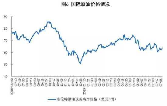国际原油价格震荡下行。7月31日布伦特原油现货离岸价格为64.1美元/桶,比6月28日下跌3.5美元。