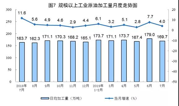 7月份,加工原油5260万吨,同比增长4.0%,增速比上月回落3.7个百分点;日均加工169.7万吨,比上月减少9.3万吨。1—7月份,加工原油36973万吨,同比增长5.6%。