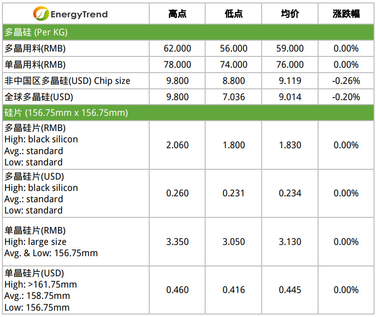 本周多晶硅料价格依旧维持价格稳定与供需两端平衡状态,除了海外市场受到汇率持续贬值影响,整体价格向下修正,国内市场则是以既定订单生产交货,也没有额外的供给与需求变化。产能利用率部分,随着大厂陆续开出新产能与检修产能归队,预期9月份的供给量会多于8月份。目前海外价格修正区间至8.80~9.80USD/KG,均价下调至9.12USD/KG,全球均价则是下调至9.01USD/KG。国内多晶用料维持不变在56~62RMB/KG,单晶用料维持不变在74~78RMB/KG。